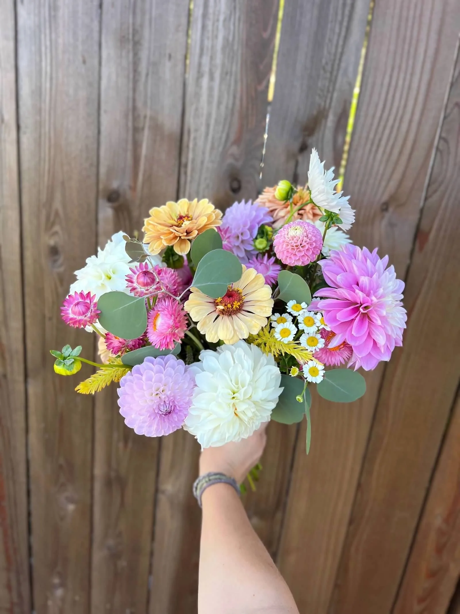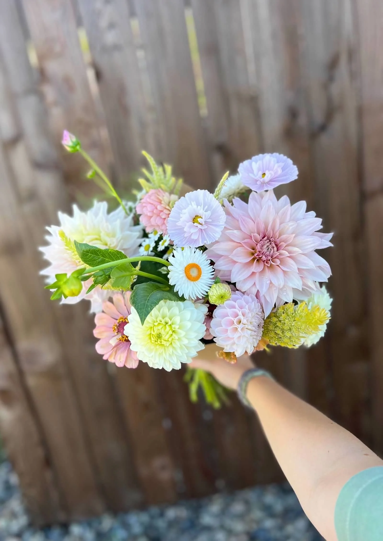 Tip 2: Start with a focal, a filler, a spike and a foliage. While these are not required to have a beautiful arrangement, I find that bouquets with these 4 types of ingredients are always my favorite! A focal flower is your feature flower (such as ranunculus, peonies, sunflowers, and dahlias). A filler flower is another flower type that will complement your focal (such as zinnias, cosmos, feverfew, and rudbeckia). A spike flower is a flower that has multiple flowers on a single stem one stacked on the next (such as snapdragon, larkspur, and delphinium). A foliage is any type of green leafy stem (such as varieties of mint, shrubs, and eucalyptus). If you don’t have all of these components, don’t worry! You can still make an incredible arrangement if you’re missing one.